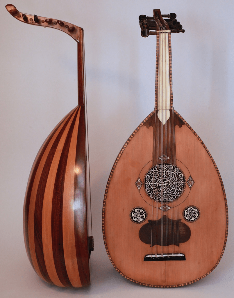 „Die Oud (bisweilen auch ‘Ud geschrieben; das grammatikalische Geschlecht im Arabischen ist maskulin) ist eines der populärsten Instrumente in der arabischen Musik. Der Name bedeutet “kleiner Holzstreifen” auf Arabisch. Dies bezieht sich auf die Holzstreifen, die benutzt werden, um den birnenförmige Korpus des Instruments herzustellen. Der Hals des Instruments ist im Verhältnis zum Korpus ziemlich kurz. Er hat keine Bünde. Dies erlaubt dem Musiker, eine exakte Intonation zu erreichen, und macht das Instrument ideal für das Spiel arabischer Maqamat.“